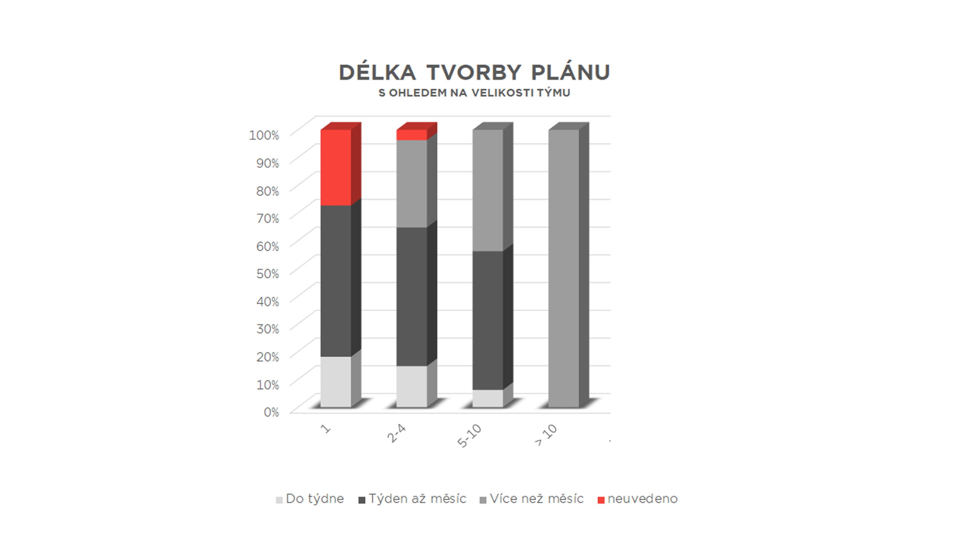 Průzkum také ukázal, že když se ve firmě věnuje plánování jen jeden člověk, je v téměř 70 % schopen vytvořit plán cca do měsíce. Pokud se do plánování zapojuje více než deset lidí, trvá jim to ve 100 % případů déle než měsíc. “Laicky by se mohlo zdát, že když plánuje více lidí, musí to mít rychleji. Opak je pravdou. Celý proces se totiž s rostoucím množstvím přispěvatelů stává komplexnější,” říká Petr Sládek.