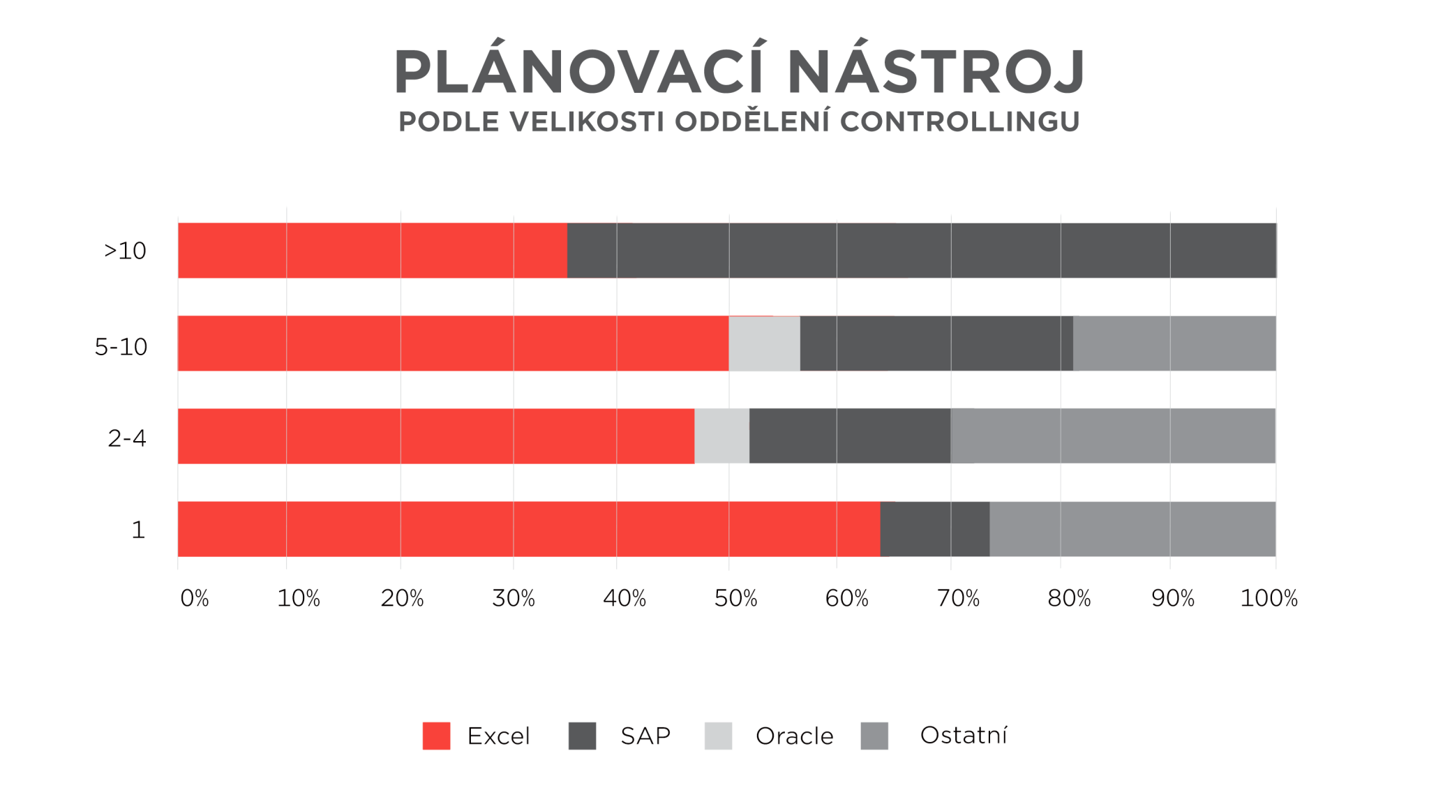 Tabulka v Excelu vyhovuje ze 65 % firmám, které mají v controllingu jen pár lidí, zpravidla mezi jedním až čtyřmi. Firmy s více než padesáti zaměstnanci, kteří se do plánování zapojují, naopak z 82 % využívají jiné nástroje, například Oracle a SAP. Často se ale nejedná o plnohodnotné plánovací platformy, ale pouze použití existujících nástrojů (databází, ERP systémů) i pro vznik plánu.