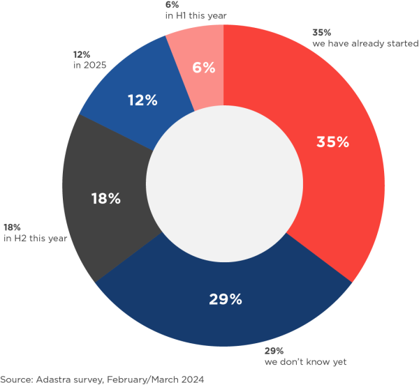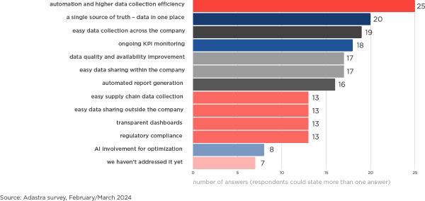 A total of 24% of companies are planning for continuous ESG data collection during this year, with another 12% planning for 2025. As many as 29% say that ESG reporting is addressed, but not at the level of data, but as a regulatory obligation. They have no plans to digitize ESG data yet.