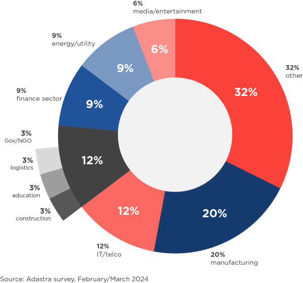 Respondents to Adastra’s survey represent various industries. Most responses came from the manufacturing sector (20%), followed by IT/telco (12%), energy and utilities (9%) and financial sector firms (9%). A total of 32% of respondents said they came from another sector, specifying examples including retail and consulting.