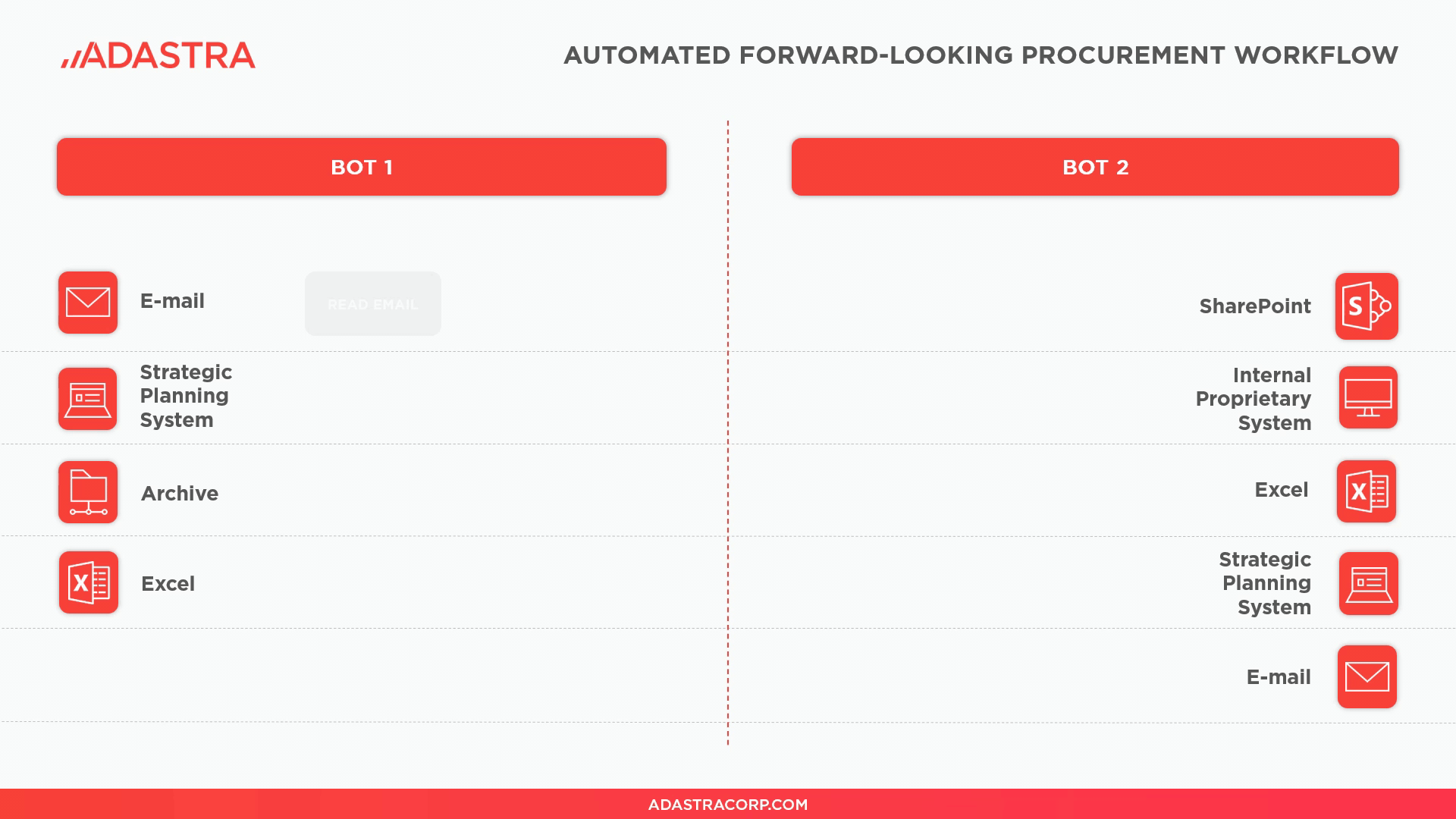 Then comes the second bot, which finalizes the whole process. It takes its input data in the form of an Excel file from a centralized location. The bot then downloads BI Reports and fills the missing data in the input file. After making sure that all available data is entered and the file is up to date, the bot begins navigating the strategic planning system. There it enters all the data from the input file that is deemed valid and informs the responsible people if any issues arise or if the process was a success. This is done in the form of emails, where each completed step is described, easing the work of the responsible person.