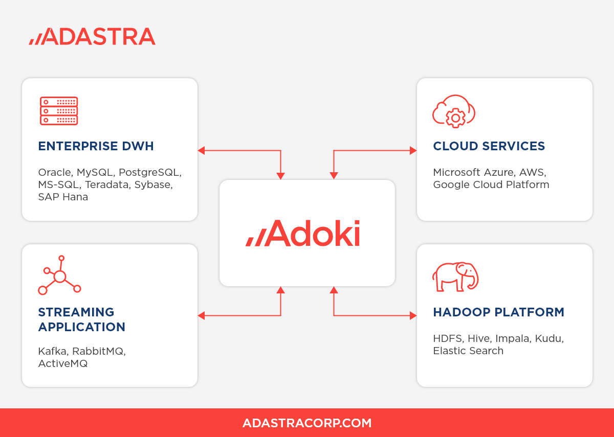 Adoki’s first major task was to integrate data from 8 of the car manufacturer’s production databases to the DAP. Today, it integrates data from many other relational systems, including MS-SQL, Oracle, PostgreSQL and SAP HANA, as well as non-relational systems like Jira.